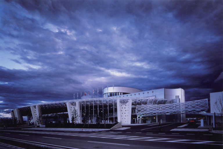 「ビッグパレットふくしま」(福島県郡山市)は、多目的展示場と国際会議場からなる複合コンベンション施設です。外観を特徴付ける楕円 形の大屋根「マザールーフ」の形態が「ビッグパレット」という名の由来となっています。工業と商業の都市として発展した郡山市の歴史を 継承し、さらに未来に向かって人・もの・情報の「流れ」をこの地に繋留して新たな文化と経済を育む「インキュベーター(孵化器)」とし て、この建物が構想されました。郡山盆地に浮かぶ「一粒の水滴」が原イメージとなってデザインコンセプトが構築されています。屋外展示 スペースは、グライダーやヨット等に使用される新素材CFRP(炭素繊維強化樹脂)製のキャノピーで軽快に覆われ、光や風を透過しながら雨 を遮断する快適な環境が確保されています。全長約220mに及ぶペデストリアンデッキは2階のエントランスロビー(アトリウムロビー)へと つながり、多目的展示ホールとコンベンションホール・会議室等のコンコース=アトリウムにつながっています。またカテナリーカーブのルー フストラクチャー、キールトラスを結ぶ逆円錐形のファンコラム、HPシェルを横に連結したペデストリアンデッキ、カーボンファイバーなど 高度な技術や最新素材を駆使したダイナミックで先進的なデザインが人々を惹き付けます。